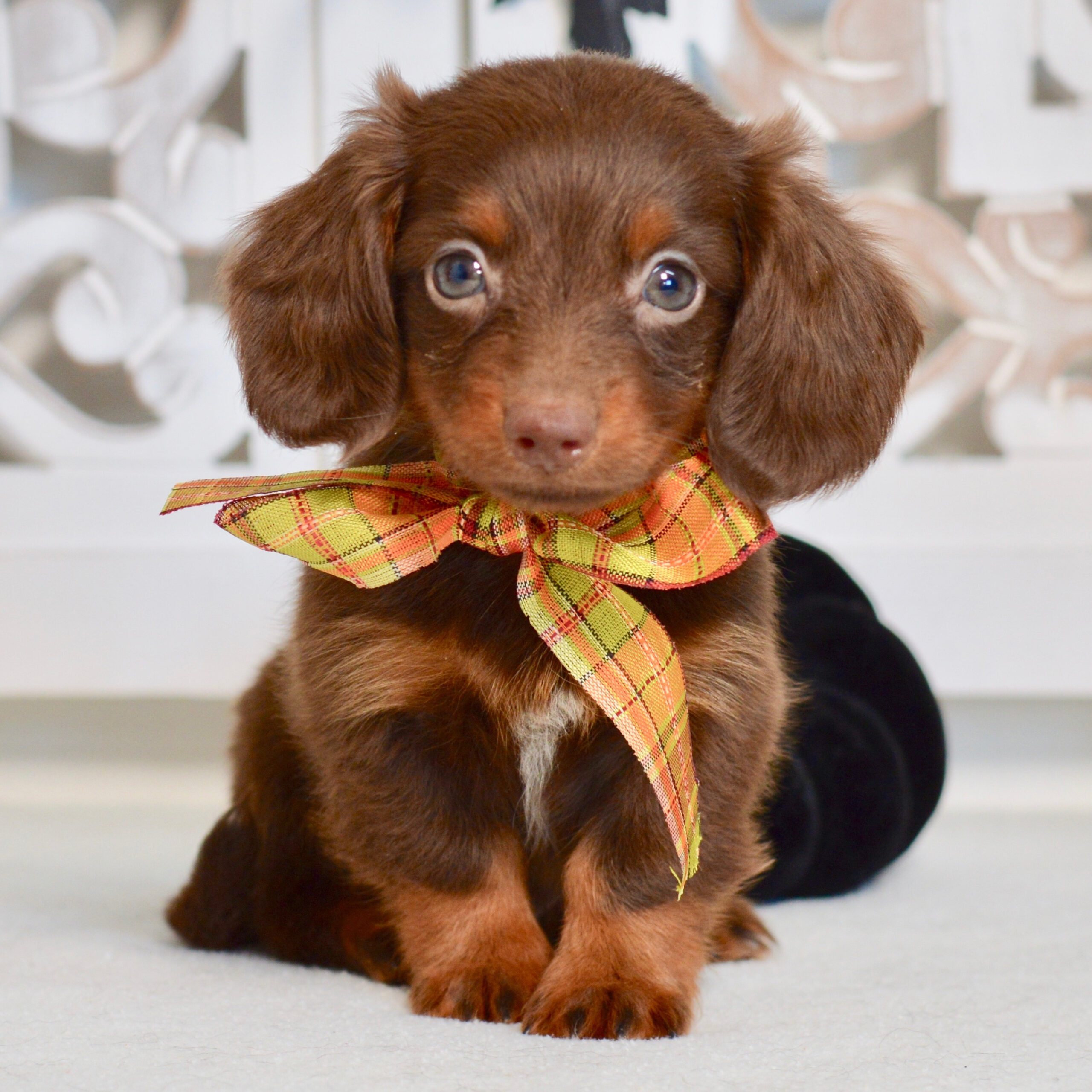 Hi, I’m Sutton! I’m a 15-week-old male Dachshund with a beautiful black & tan coat, born on August 28, which makes me a Virgo pup. I am ready now to plan my trip to my forever family. I’m UABR registered. If a sock goes missing, I might be the culprit. I love mischief.
